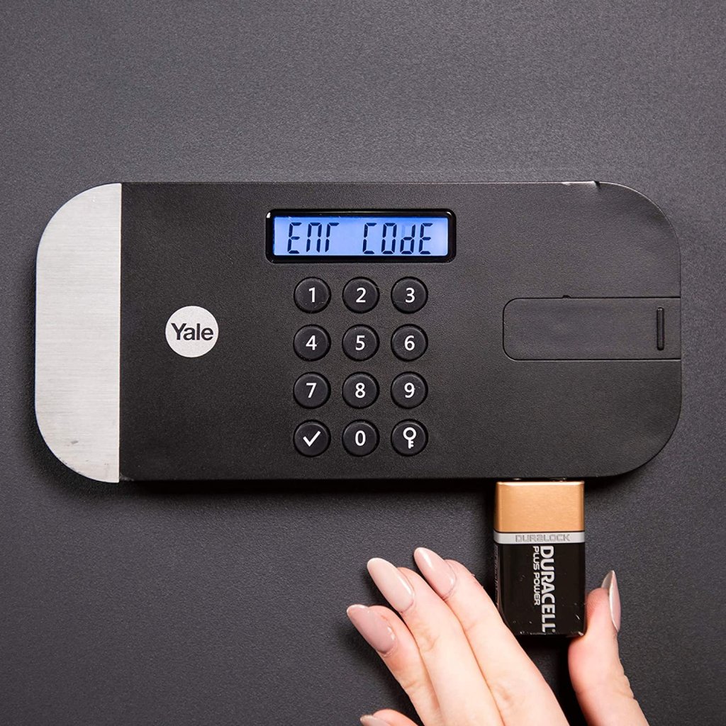 Yale Guest Small furniture safe, electronic code locking, blue backlit display, lever double-sided locking system. Height 200 x width 310 x depth 200 mm, internal dimensions 197 x 307 x 137 mm.